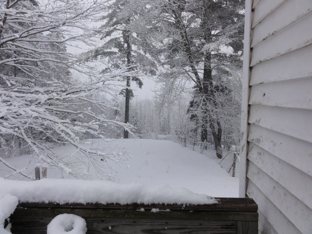 This winter came too early. Almost by a month, it came with snow and a few degrees colder, 2 nights below zero. It came before the last two weeks of November, and today, another foot of snow is added to the land, that already had a foot and a half of it. It is warm enough to ignore the woodstove  at mid day. It will eventually have to be kindled and re lit, it is that sort of temperature, not too cold outdoors, but heavy snow falling, about 2 inches on every branch and wire . The overcast November is brightened considerably, amazingly. It came early but this snow is impressive in it’s covering. So much so that I am arguing with my body, my body that prefers rest, whether to get up and get the camera or not.  I think not. The commander, the executive function, was with pain for so long, now that the bad joint was cut away and replaced,  I just want the absence of pain to be my pleasure, I never ask for much, it is known.  So I will lay here and use words instead of pictures to remember the snow. Because in the end it is not the image that is unique, but it is the seconds that have already passed, and my being in it, that is unique to the present. See, it’s gone already. So fickle, such a history we have together, this mind and this body.  If I throw in the heart and the spirit, the constant arguing of each other and vying for position of priorities, it is enough to warrant a respite , to dig a den under a laden shrub, to bury my nose from the cold air, like a fox. I learned a theory about  centers a sentient being has, and depending on the creature,  what center dictates behavior and survival. In woman, and in male, there are more advanced centers, than, say, a fox.  Intellectual, Emotional, Moving, Instinctual, Higher Emotional (Holy). Our lifetime struggle is balancing these, using them appropriately, finding harmony within this solar system of atomic formation that can end in consciousness. Instinctual center call on me to be a fox, getting up to feed and excrete, drink and sleep. Emotional and Intellectual center create an image and feeling of safety and repose and beauty, as a fox nestled under a snowy forsythia shrub, lower emotional center sees an image of a fox with a warm fire instead of its deep fur, and may throw in a blanket , and then add colors of warmth with the light ultra violet of snow under a gray falling sky. Moving center is on a sabbatical, and Higher  Emotional center is at once humbled and praising , with reverence and respect and compassion for the creatures who are not waxing poetic, but surviving out in these elements. Too soon for them also, I think.
